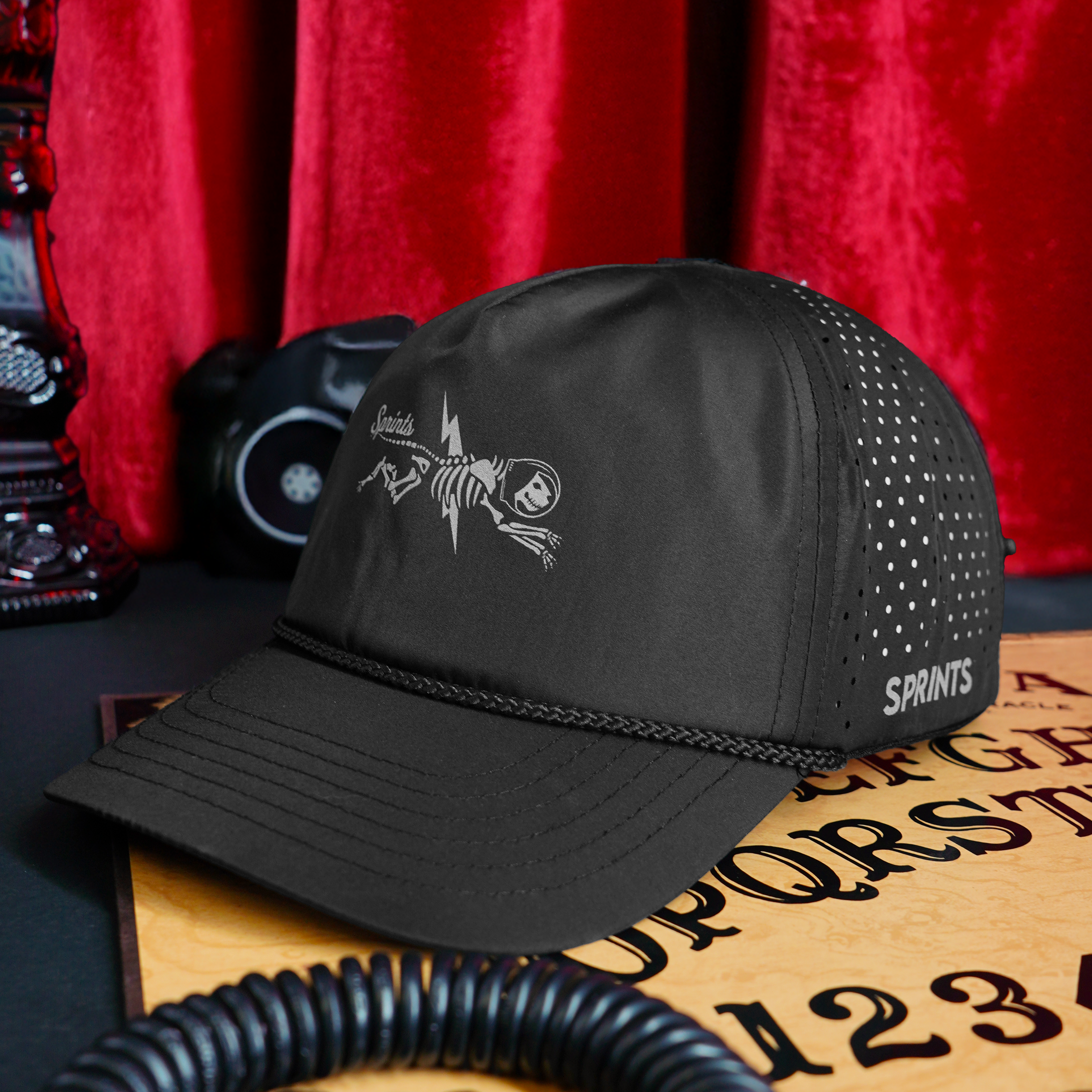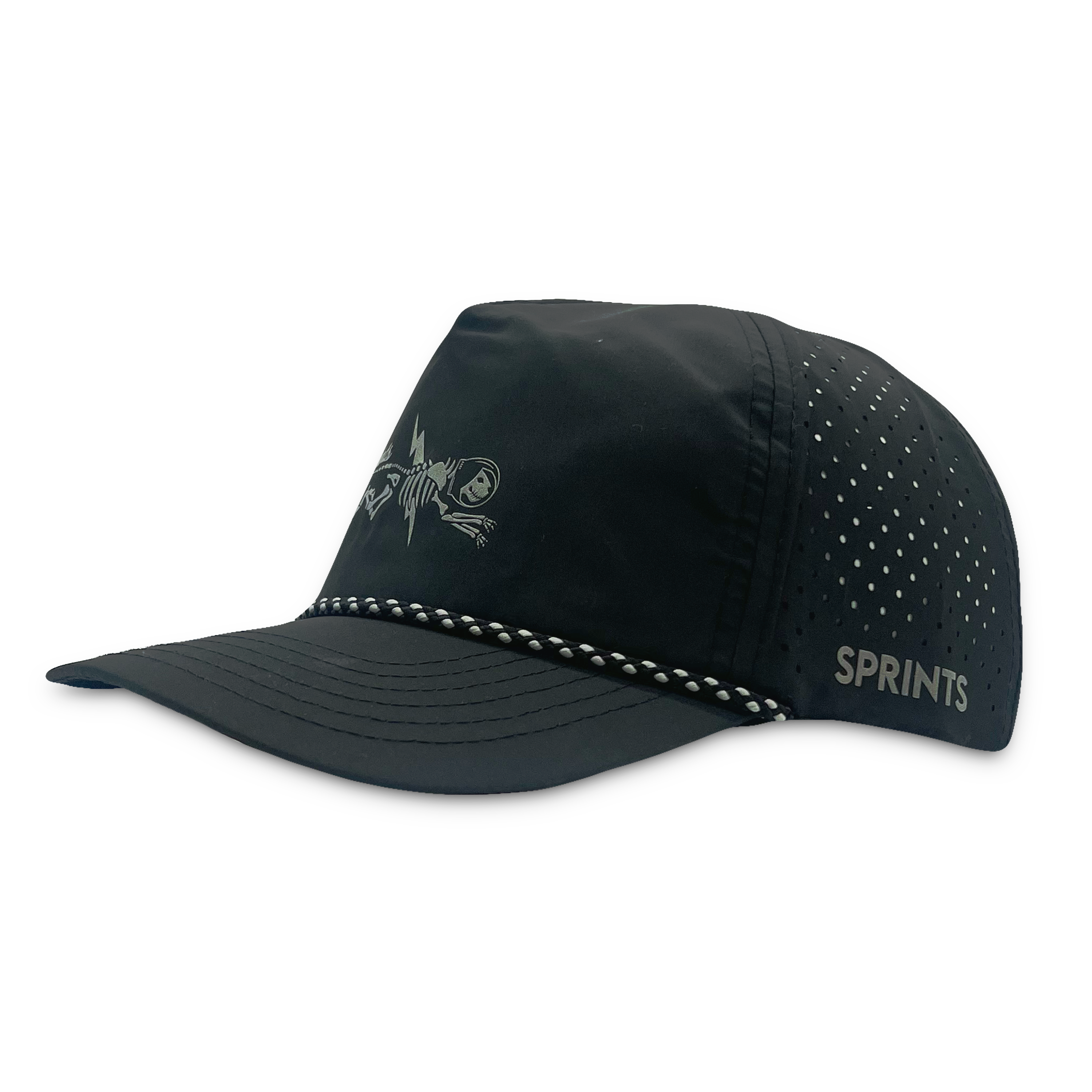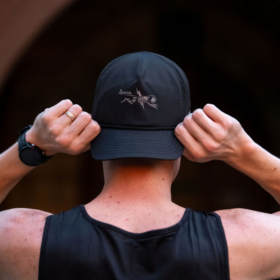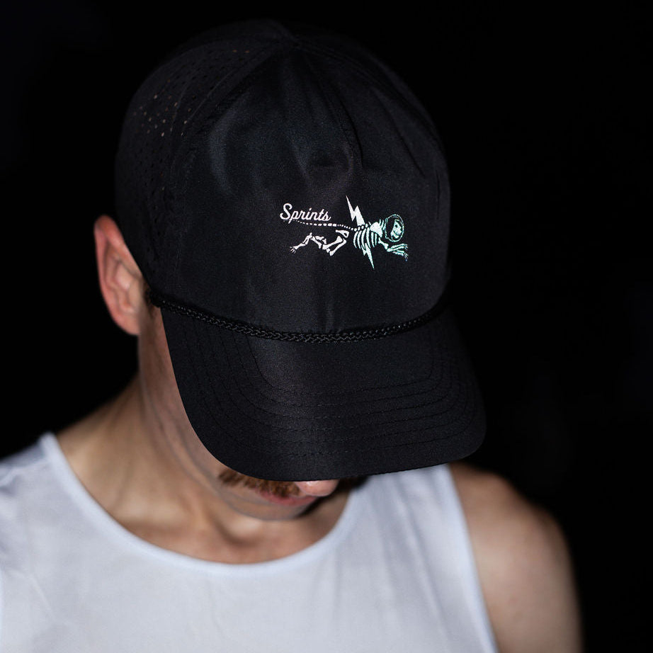 Shock Beast Miles features the legendary Sprints jag mid mutation. And by mutation we mean he’s been struck by 300 million volts of lightning. Fur fried, helmet intact, it’s reflective electric chaos representing how you feel at mile 18 all reverberating in a snapback rope style hat.