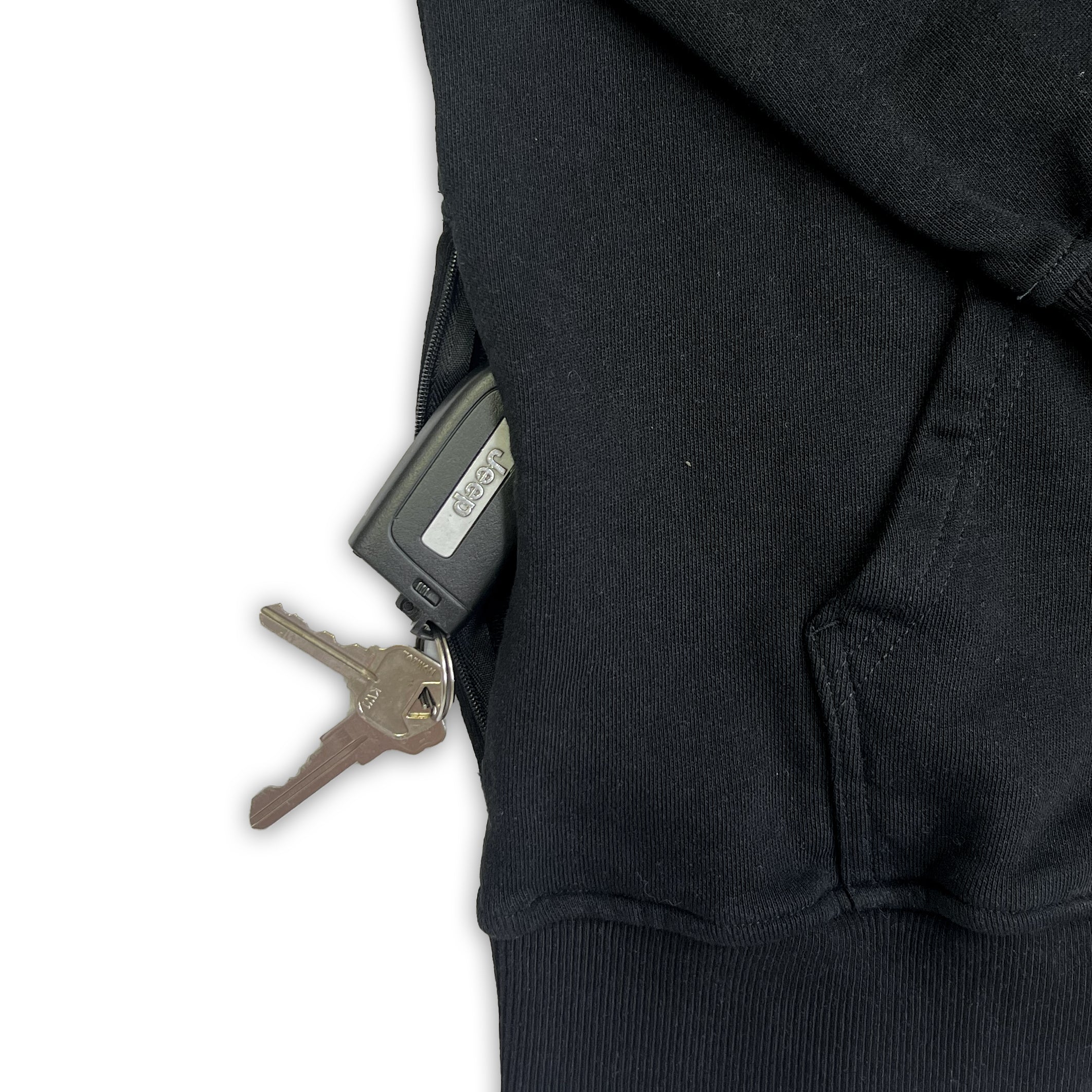 In addition to a standard kangaroo pocket. This hoodie features a phone-size, zip pocket for your valuables.