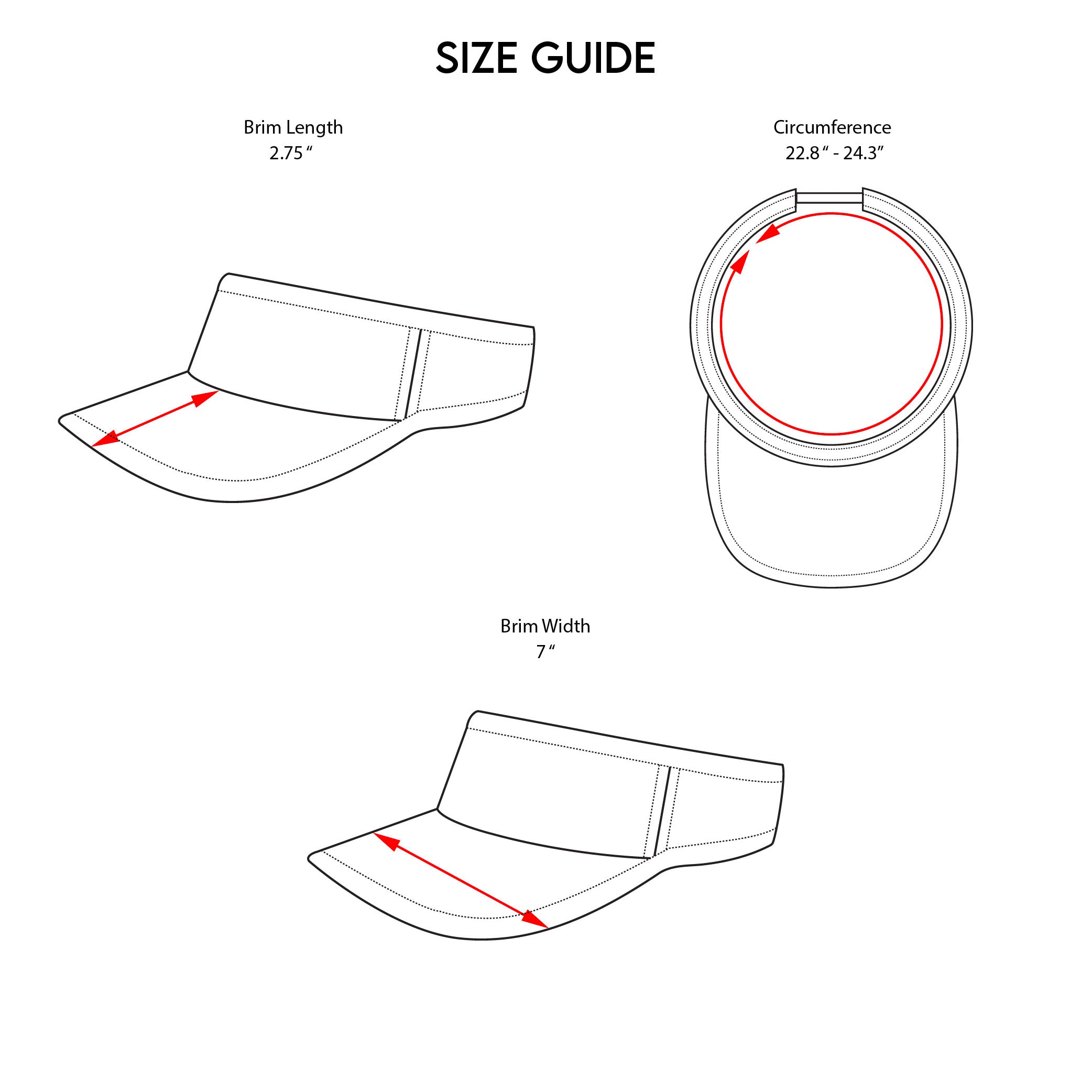 Sprints Visors feature an adjustable velcro closure on the back. The circumference is 22.8 inches and expands to about 24.3 inches which is a hat size 6 & 1/4 to 7 & 7/8.
